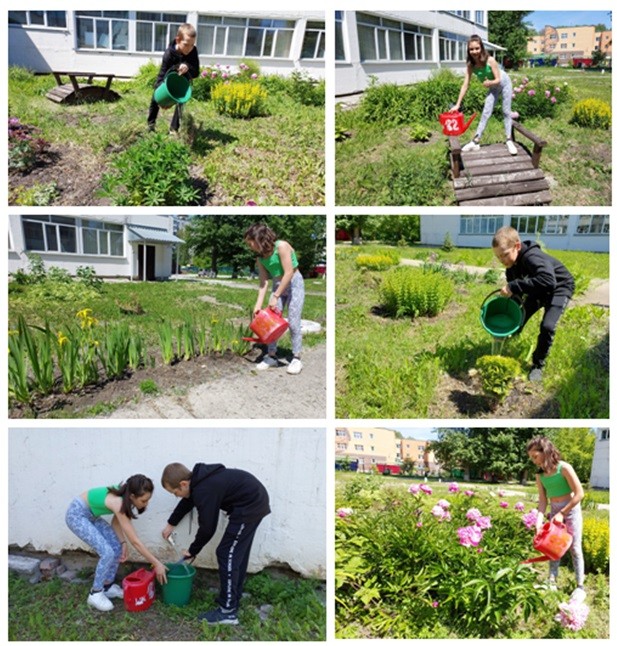 Ребята успевают везде: не только собирают мусор и макулатуру, но не забывают о наших «зеленых друзьях». Полив – один из самых главных моментов в уходе за растениями на пришкольной территории.